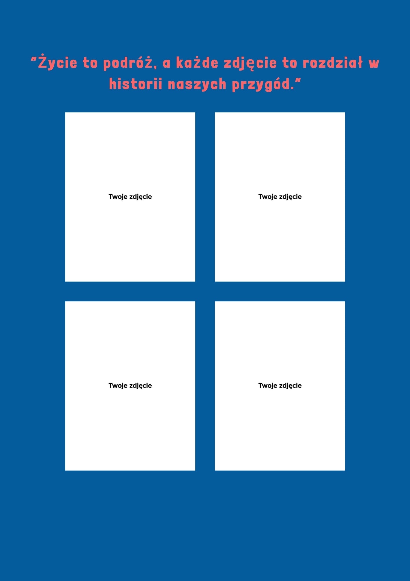 - Podczas realizacji zakupu należy przesłać 66 zdjęć + 4 na okładkę oraz podać datę pobytu/wydarzenia (data widoczna na okładce jest przykładowa, po przesłaniu Państwa daty zostanie ona umieszczona na okładce). Zdjęcia są profesjonalnie układane przez nasz zespół. Fotoksiążka produkowana jest w formacie A4. Na tylnej okładce znajduje się nadrukowany kod kreskowy. (Zdjęcie nr. 3 ma charakter poglądowy)